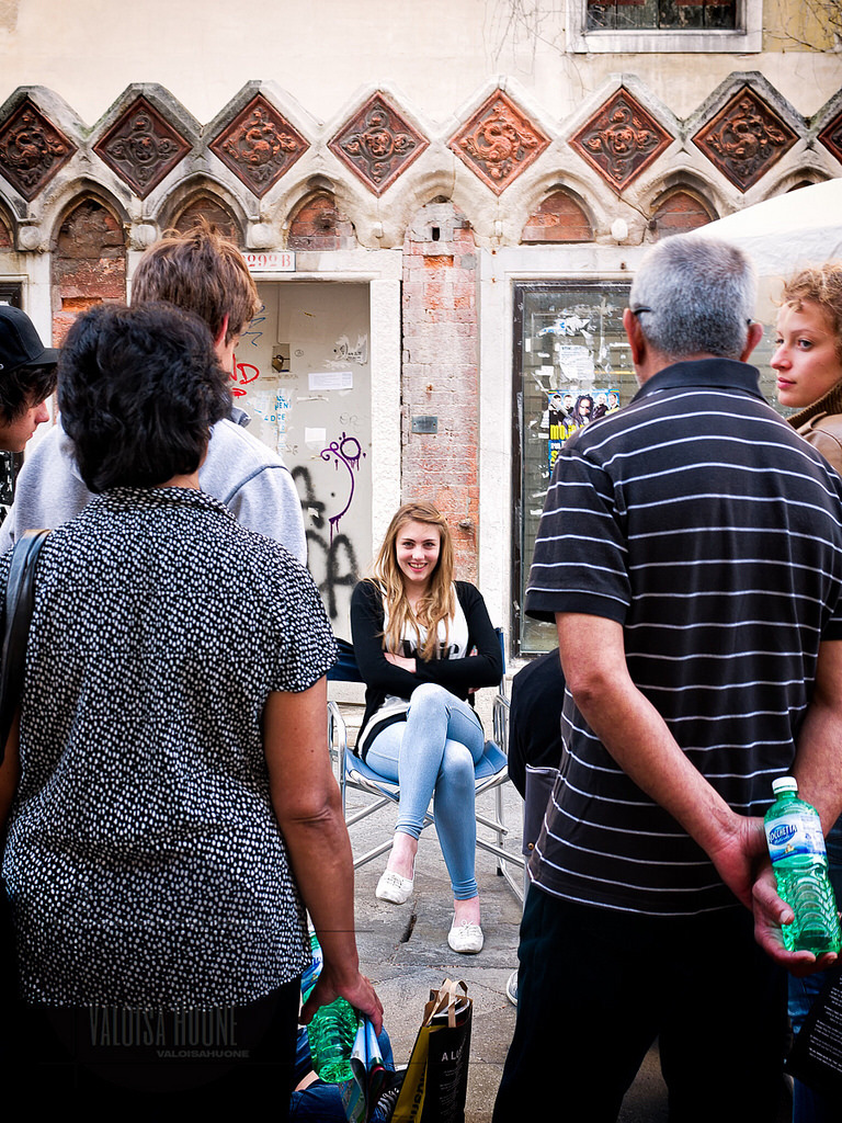 Girl was sitting as a model for artist, charcoal drawing I guess. Artist was drawing, girl was chatting and laughing with her friends and the rest of the crowd was looking the scene. Common sight in any European city popular with tourists. No need to stop there.